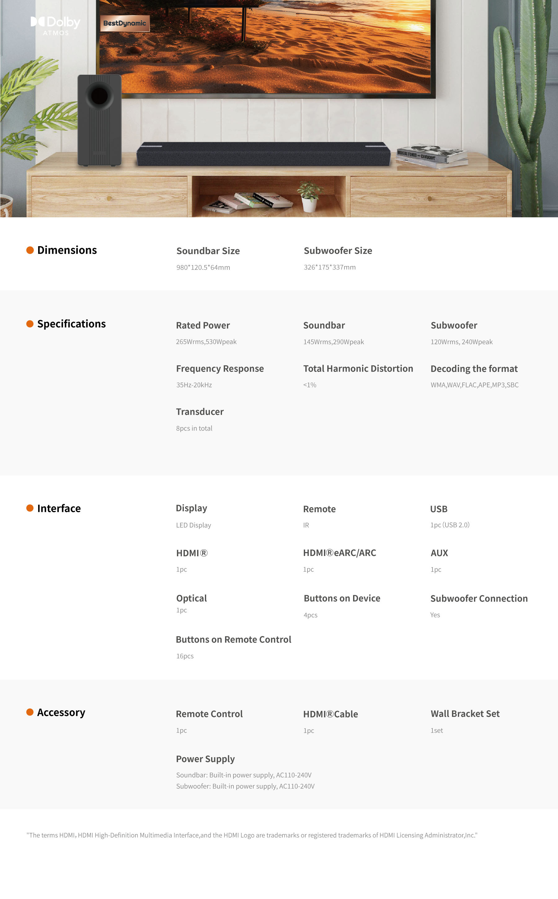 • 接口及配件:配备HDMI® eARC/ARC、红外遥控……